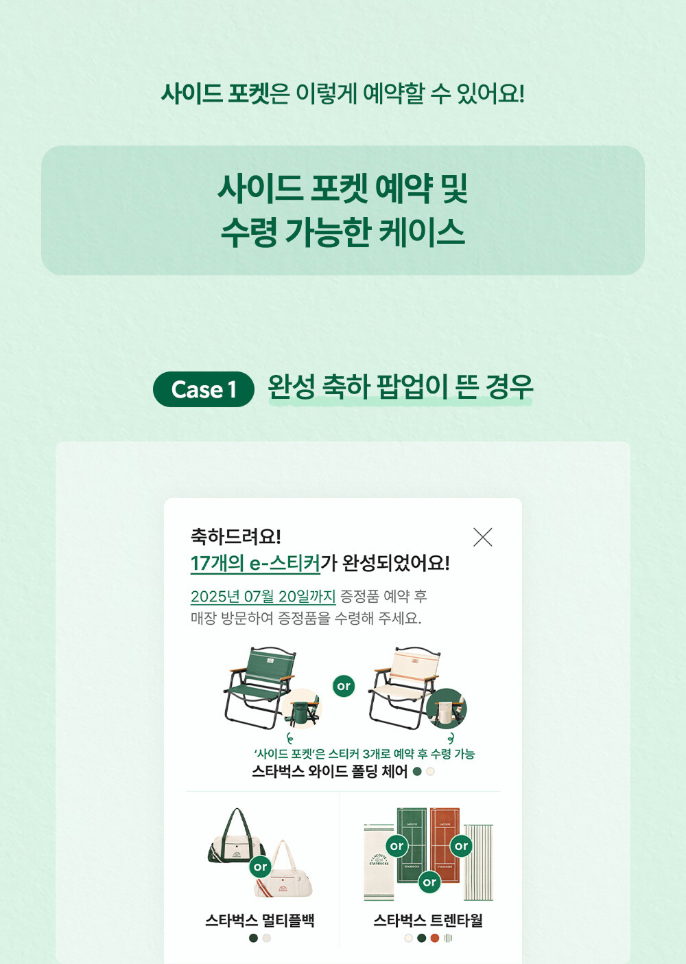 - 프리퀀시 완성 후 음료 3잔 추가 구매 시 사이드 포켓 예약 가능